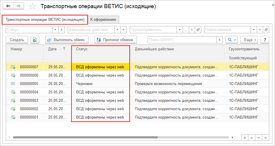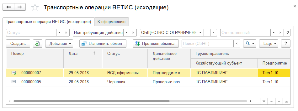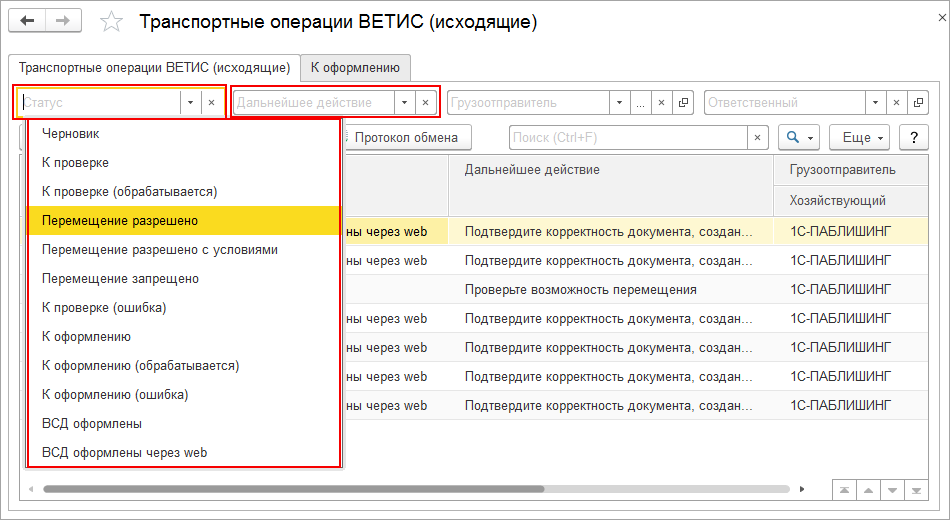 Предусмотрена возможность отбора исходящих транспортных операций ВЕТИС в соответствии с их статусами и действиями, которые необходимо выполнить при работе с этими документами.