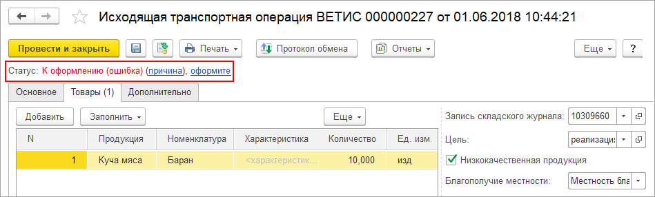 - К оформлению (ошибка) — по результату обработки в сервисе произошла ошибка, заявка на оформление транспортной операции отклонена с указанием причины (например, не заполнен номер транспортного средства). После того как будет устранена причина отклонения документ можно вновь оформить по соответствующей гиперссылке на форме документа (оформите).