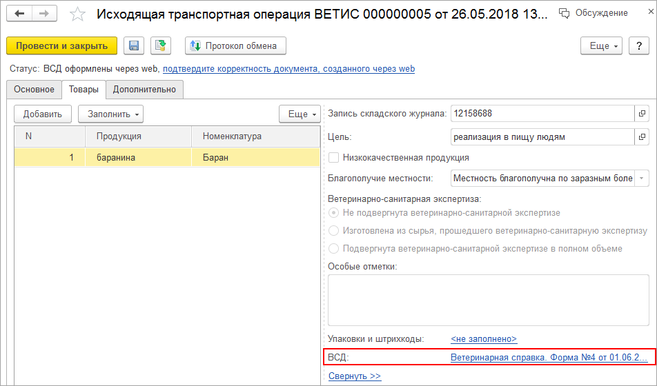 По результату оформления транспортной операции будет автоматически создан исходящий электронный транспортный ветеринарный сопроводительный документ (ВСД), который доступен по соответствующей гиперссылке реквизита ВСД (на закладке Товары).Рис. 9