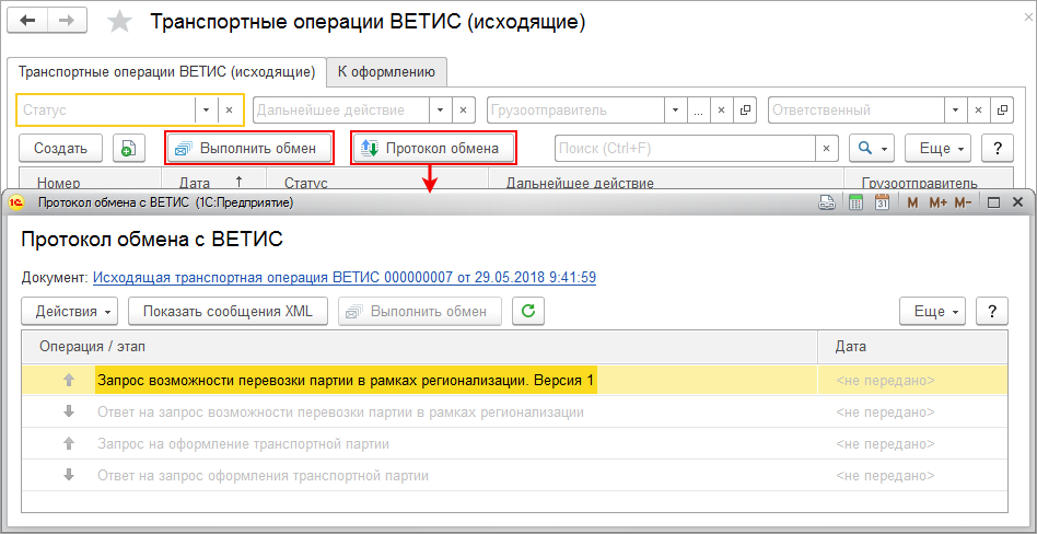 Список всех выполненных и предстоящих операций можно открыть по команде Протокол обмена (рис. 12). По каждой выполненной операции можно просмотреть отправленные XML-сообщения.