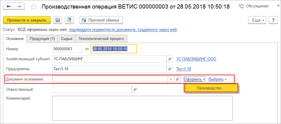 Основанием для оформления производственной операции ВЕТИС может выступать документ Производство.