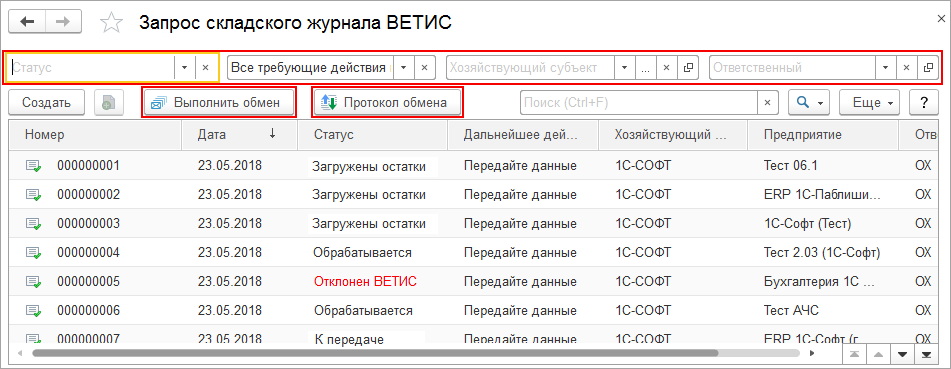 Для обмена данных с системой ВЕТИС предусмотрена команда Выполнить обмен. Список всех выполненных и предстоящих операций можно открыть по команде Протокол обмена.