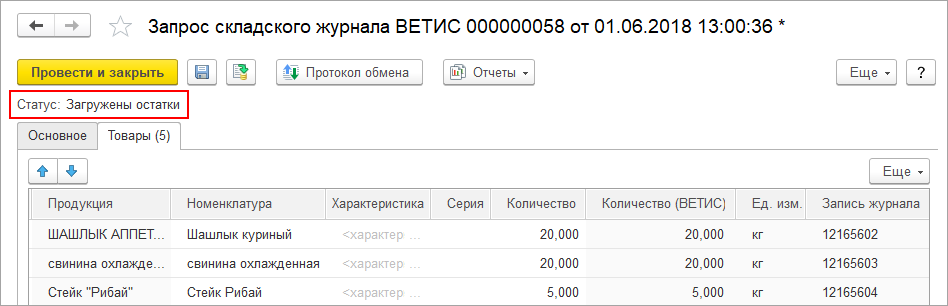 - Подготовка и формирование запроса на получение складских остатков продукции ВЕТИС. Документ формируется в статусе Черновик. Необходимо передать данные для загрузки остатков (гиперссылка передайте данные на форме документа).