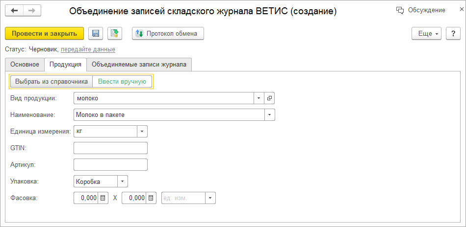 Информация на вкладке Продукция (рис. 3) заполняется при отражении типа операции Объединение записей. Заполнить продукцию можно путем выбора из справочника Продукция ВЕТИС или вручную.