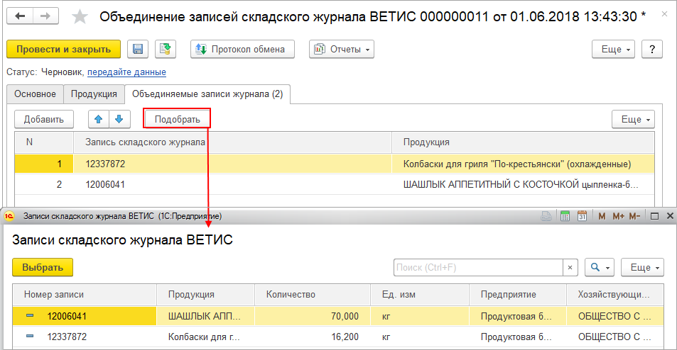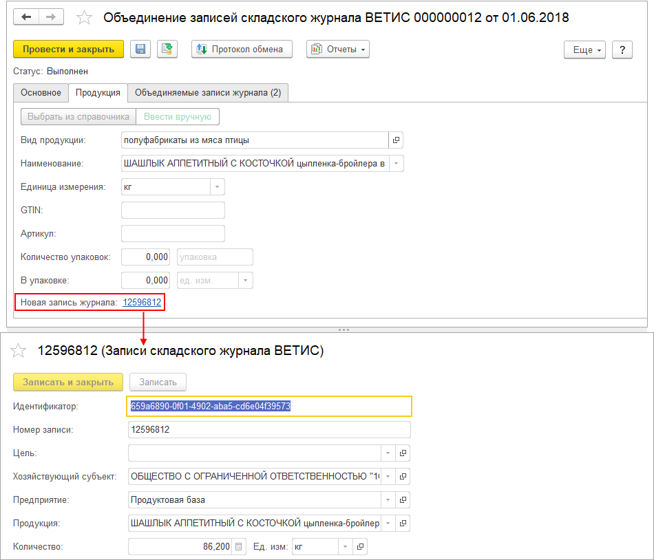 По результату объединения указанных записей будет сформирована новая запись складского журнала продукции и эта запись по умолчанию добавляется в журнал продукции.