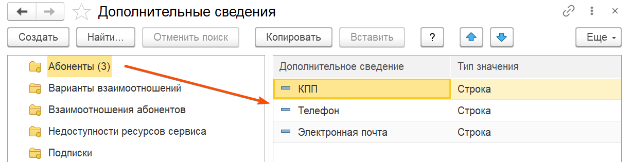 Если они не созданы, их нужно создать: Главное → Настройки конфигурации → Дополнительные сведения Далее для абонента создать строковые дополнительные сведения: Убедиться что имена для разработчиков соответствуют указанным. | |||||||||