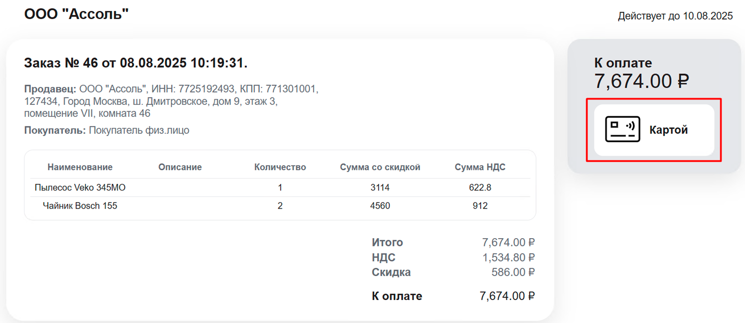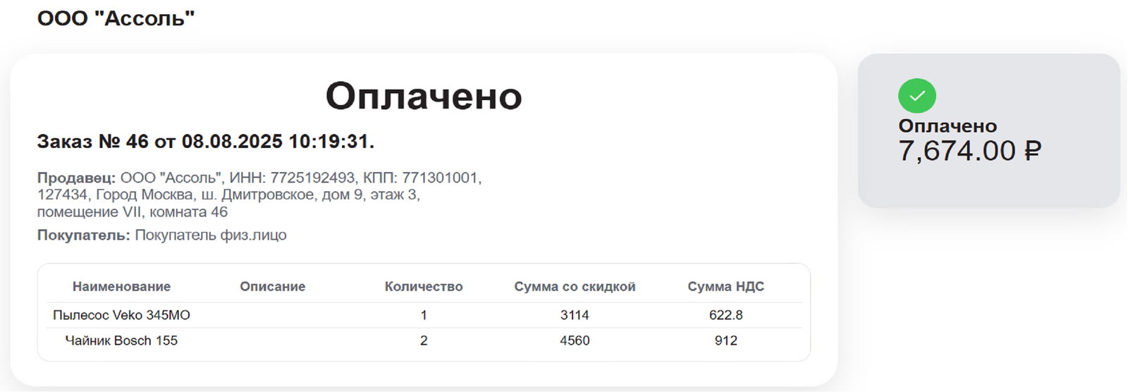После оплаты, на странице заказа появится информация, что заказ успешно оплачен: