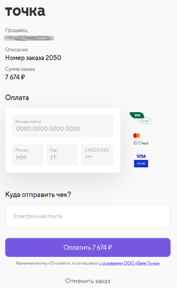При нажатии на кнопку выполняется переход на платежную страницу банка, который используется для приема оплат через Интернет-эквайринг:
