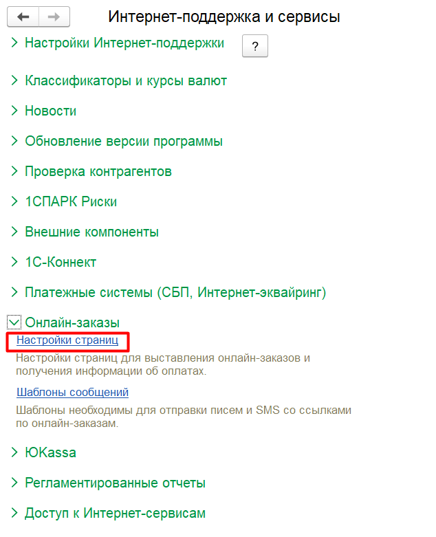 3. В программе 1С перейти в настройку Интернет-поддержка и сервисы. Как правило, в программах 1С, она размещается в разделе Настройки, Администрирование или НСИ и Администрирование. Раскрыть группу Онлайн-заказы и нажать на ссылку «Настройка страниц».