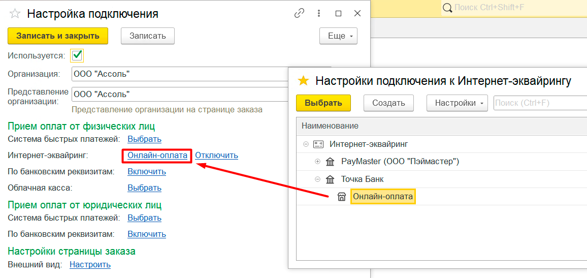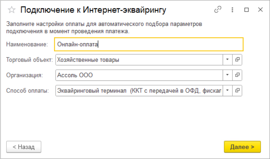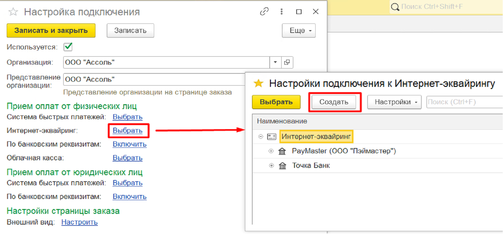 5. В настройках подключения нажмите ссылку «Выбрать» напротив способа оплаты «Интернет-эквайринг» и нажмите кнопку создать