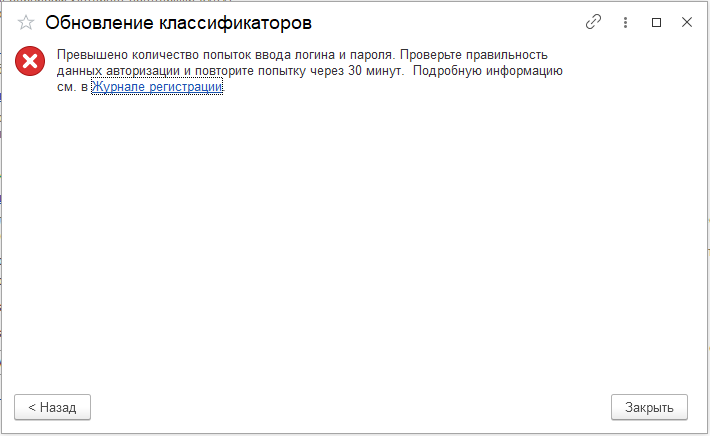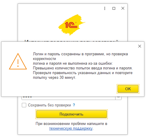 Данная ошибка означает, что логин от Интернет-поддержки временно заблокирована из-за многократных попыток авторизации с неправильным паролем. Ошибка встречается, когда пользователь изменил пароль от своего личного кабинета на portal.1c.ru, однако не выполнил вход в интернет-поддержку с новым паролем. (В Интернет-поддержке по - прежнему введены старые данные).
