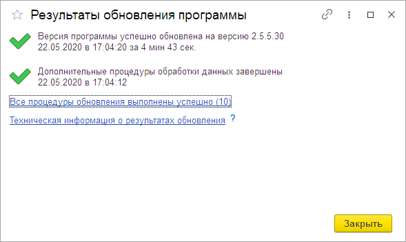 Журнал регистрации с результатами можно посмотреть по команде Техническая информация о результатах обновления или из НСИ и администрирование – Администрирование – Обслуживание – Журнал регистрации. Подробнее о журнале регистрации см. статью Просмотр и контроль журнала регистрации.