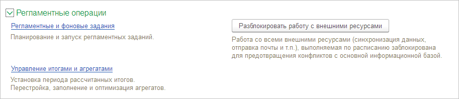 ■ Регламентные операции – настройка фоновых заданий на расчеты, загрузку курсов и иные действия, управление итогами и агрегатами по регистрам базы данных;