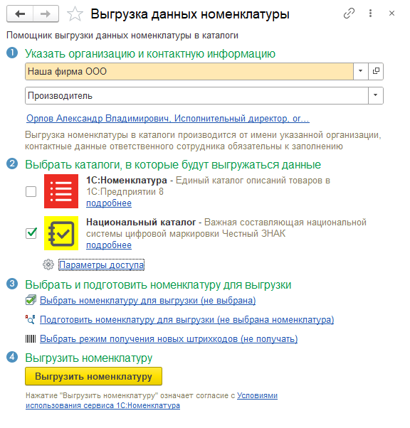 Настроен сервис 1С:Номенклатура для интеграции с национальным каталогом и описаны товары в национальном каталоге, в карточке товара указаны коды GTIN |