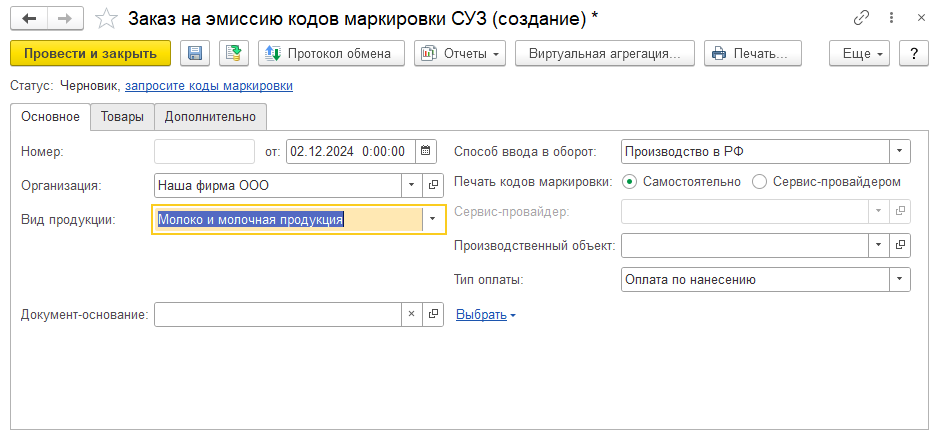 Заказ на эмиссию кодов маркировки