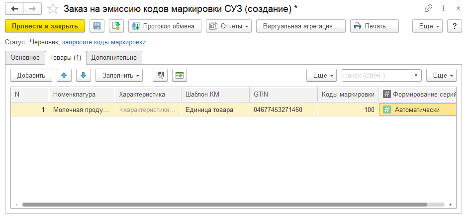 Список позиций, по которым производится заказ кодов маркировки, указывается на закладке Товары. Среди прочего для каждой позиции необходимо указать Номенклатуру, код GTIN (он должен быть предварительно получен и внесен в список штрихкодов по данной номенклатуре) и количество кодов. Также для каждой позиции указывается принцип формирования серийных номеров: автоматически или самостоятельно.