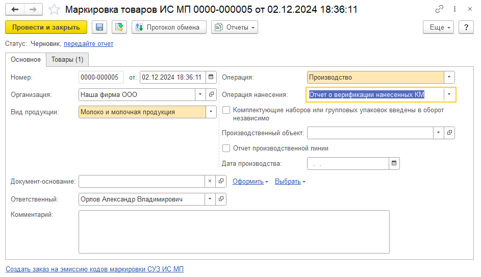 - независимо от ввода в оборот (возможно в другую дату) документом Маркировка товаров ИС МП с указанием операции Отчет о верификации нанесенных КМ. Ввод в оборот в этом случае оформляется отдельным документом Маркировка товаров ИС МП с указанием операции ввода в оборот Производство и указанием в поле Операция нанесения кодов маркировки значения <Выполнена независимо>;