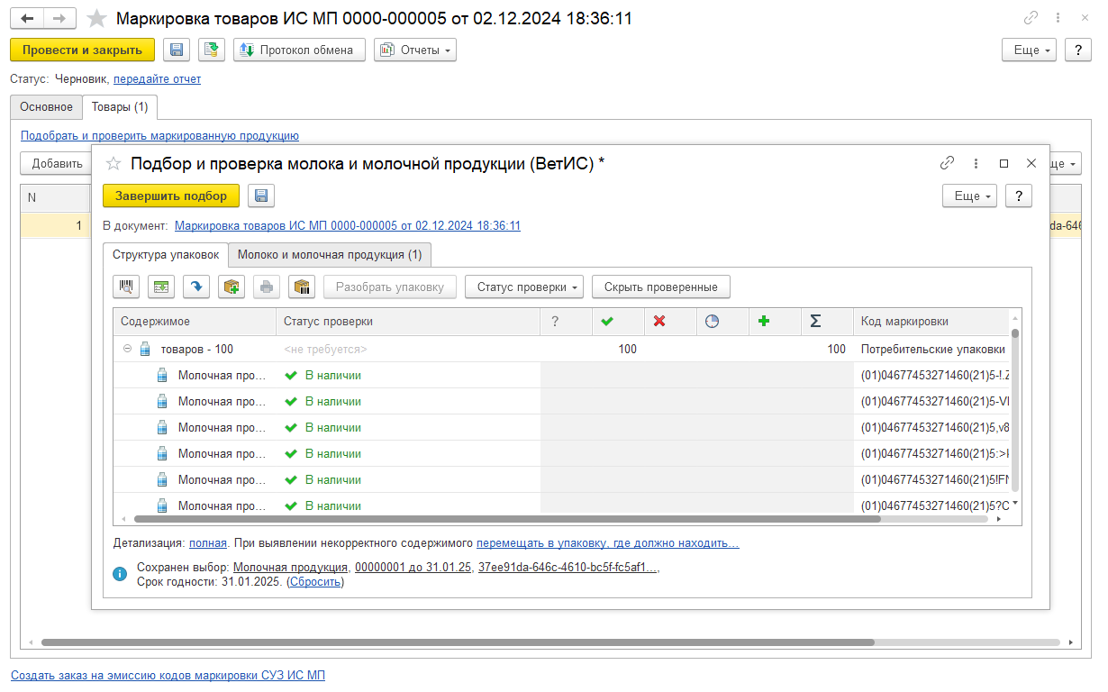 В документе указывается перечень кодов маркировки, к которым применяется операция. В случае установки флага Отчет производственной линии все коды относятся к одному наименованию продукции, которое указывается на закладке Основное. При работе со снятым флагом Отчет производственной линии (рассматривается далее) можно указать несколько наименований продукции на закладке Товары, а коды маркировки и вся структура вложенности упаковок задается в форме Подбор и проверка молочной продукции (открывается по ссылке Подобрать и проверить маркированную продукцию).