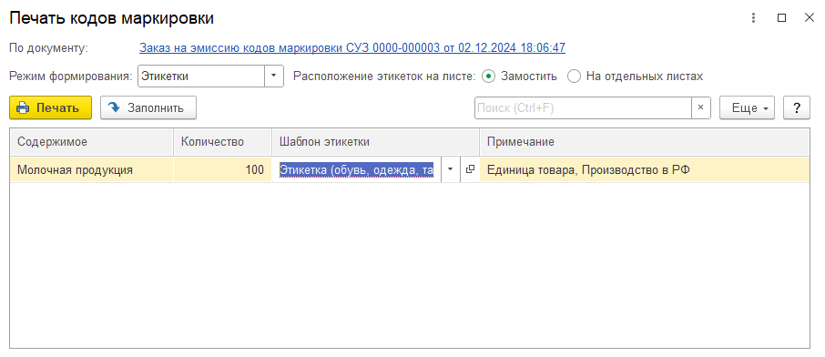 После получения кодов их необходимо распечатать и нанести на продукцию. Наиболее распространенный сценарий - предварительная печать кодов маркировки на этикетках с последующей передачей распечатанных этикеток в производство для нанесения этикеток на упаковки продукции. Для печати кодов предусмотрена кнопка Печать в документе Заказ на эмиссию кодов маркировки СУЗ. Также печать можно выполнить из списка Обмен с ИС МП (обувь, одежда, табак..) – см.также – Пул кодов маркировки СУЗ.