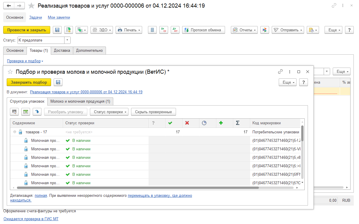 До 01.05.2025 оптовые продавцы могут не указывать все коды маркировки продаваемых товаров, а передавать только сведения объемно-сортового учета (ОСУ). После наступления даты обязательного поэкземплярного указания кодов маркировки в оптовом звене в д электронном документе необходимо указывать коды для всех товаров. С этого момента перед подписанием электронного документа рекомендуется выполнять проверку поступившей маркируемой продукции. Порядок проверки принимаемой продукции аналогичен порядку приемки продукции участниками оборота в оптовом звене. См. также раздел "Поступление маркируемой продукции у участника оборота" документации ERP, КА, УТ.