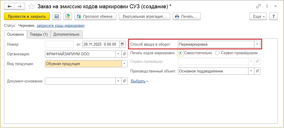 - Для заказа новых кодов маркировки используйте документ Заказ на эмиссию кодов маркировки СУЗ со способом ввода в оборот Перемаркировка. Документ находится в разделе Администрирование - Обмен с ИС МП (обувь, одежда, табак...) – Заказ на эмиссию кодов маркировки СУЗ.
