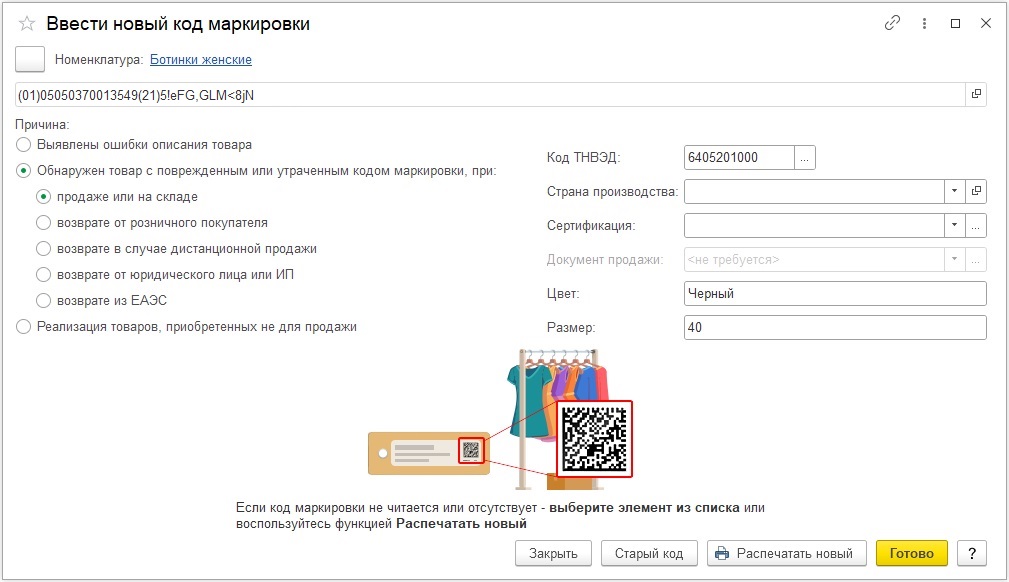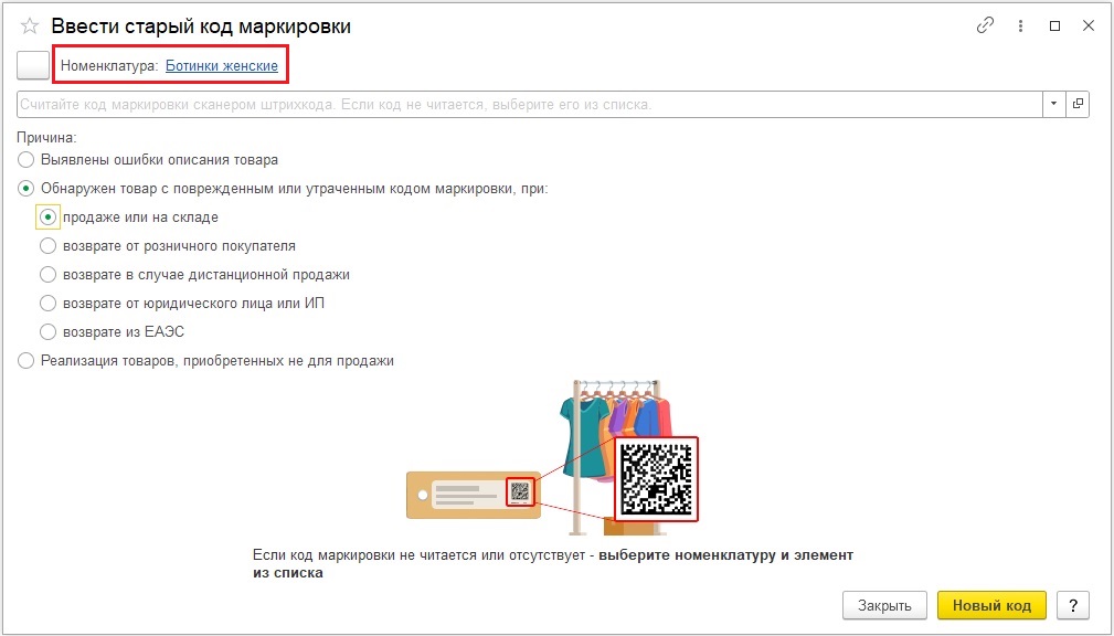 - Отсканируйте новый код маркировки.