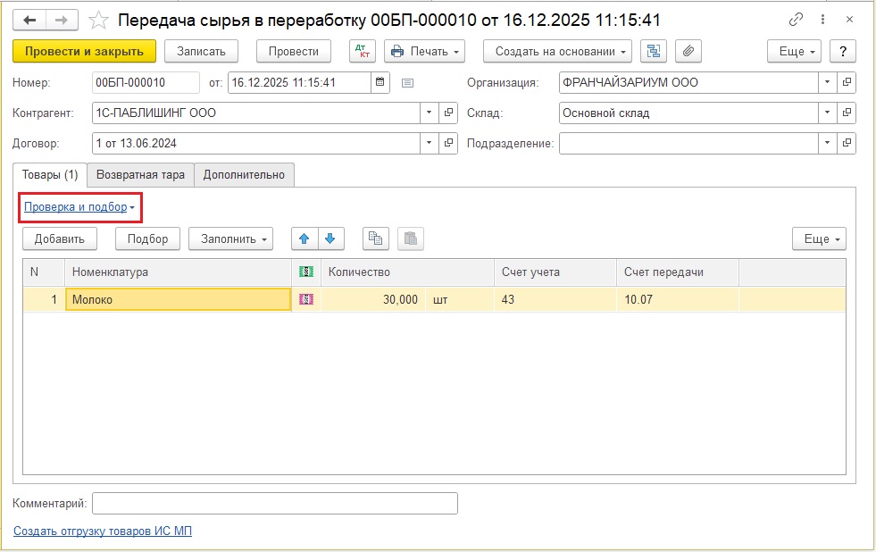 - Передача сырья исполнителю отражается документом Передача сырья в переработку. Документ находится в разделе Производство –