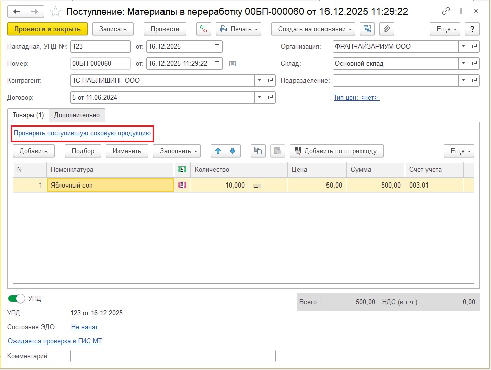 Далее документ отправляется по ЭДО. После завершения ЭДО владельцем кодов маркировки сырья становится исполнитель.