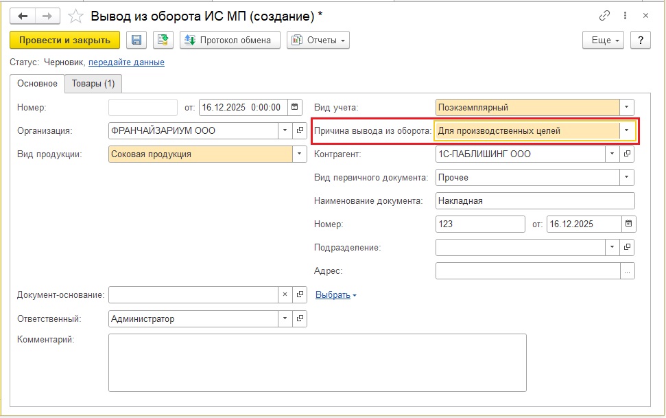 - Маркированное сырье выводится из оборота документом Вывод из оборота ИС МП, причина вывода – Для производственных целей.