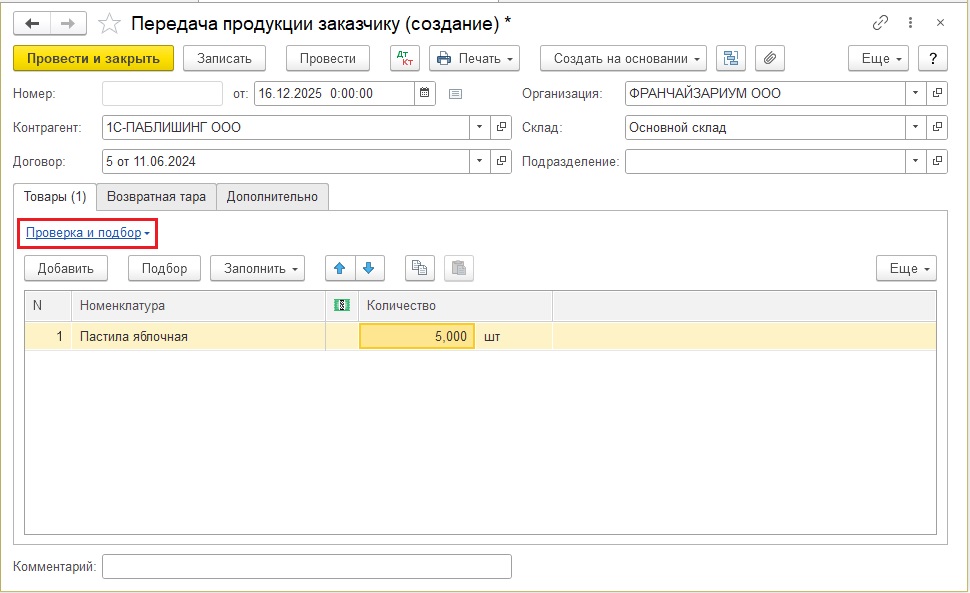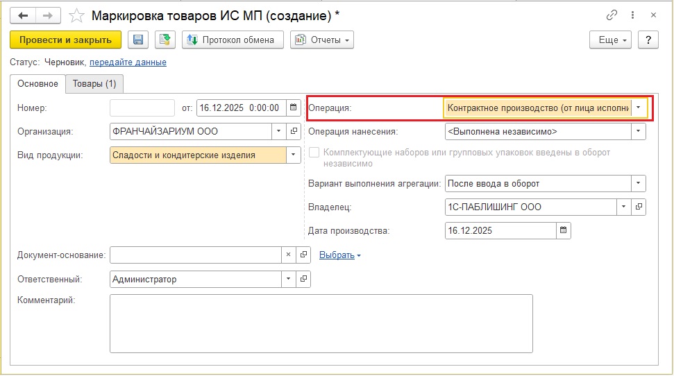 После завершения производства исполнитель оформляет документ Маркировка товаров ИС МП с операцией Контрактное производство (от лица исполнителя). Далее произведенную и маркированную продукцию необходимо передать заказчику.