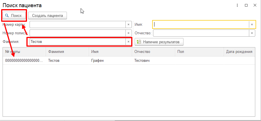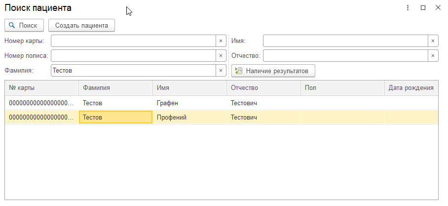В открывшейся форме «Поиск пациента» указываем данные для поиска пациента, например, в поле «Фамилия» напечатаем «Тестов» и нажмем кнопку «Поиск». Если в базе ЛИС будут пациенты с похожей фамилией, то они отобразятся в списке снизу.