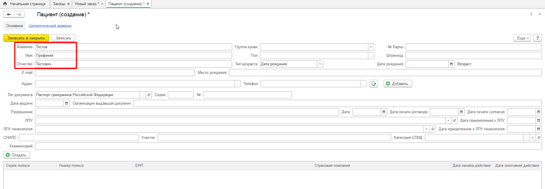 В случае, если нужный пациент не найден, его необходимо создать. Для этого на форме «Поиск пациента» необходимо нажать кнопку «Создать пациента». Откроется форма создания карточки пациента, рекомендуется заполнить максимальное количество полей. Важно понимать, что пол пациента или дата рождения могут повлиять на подбор референтного интервала, по которому будет определено патологический результат или нет, поэтому желательно указывать пол и дату рождения пациента. Для примера, в поле «Фамилия» укажем «Тестов», в поле «Имя» укажем «Профений» и в поле «Отчество» укажем «Тестович», после чего нажмем кнопку «Записать и закрыть».