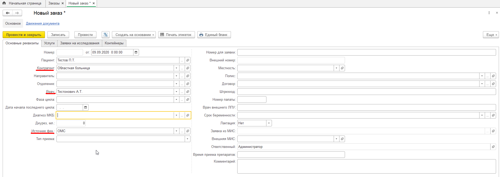 После выбора пациента необходимо аналогичным образом заполнить остальные поля заказа: