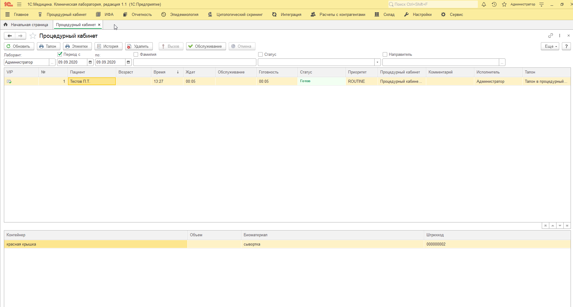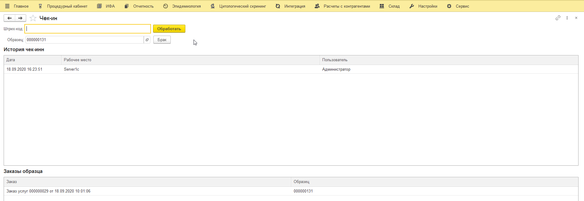 Указав штрихкод образца и нажав на кнопку «Обработать» сформируется документ «Чек-ин», который будет означать, что образец поступил в лабораторию.