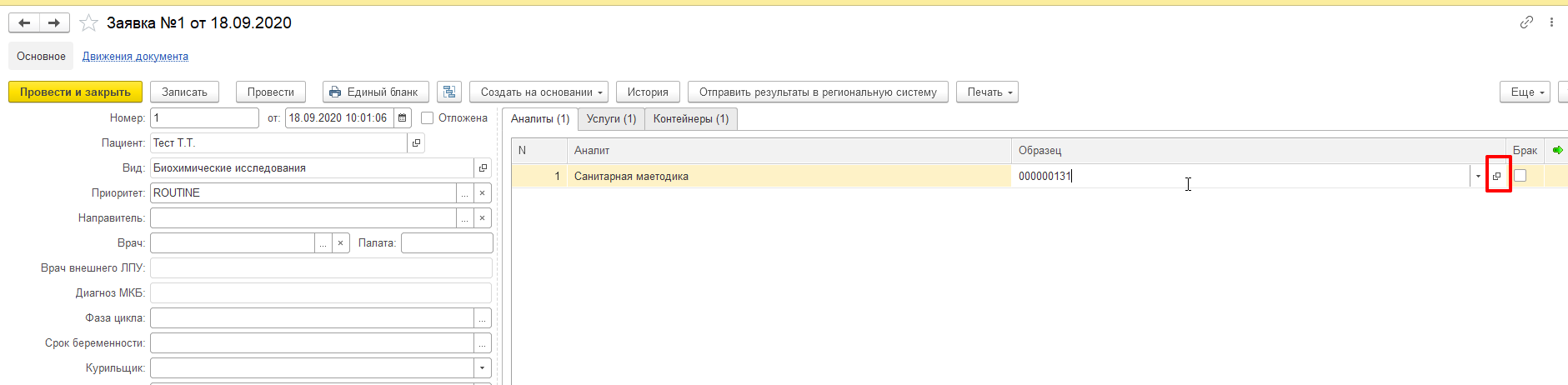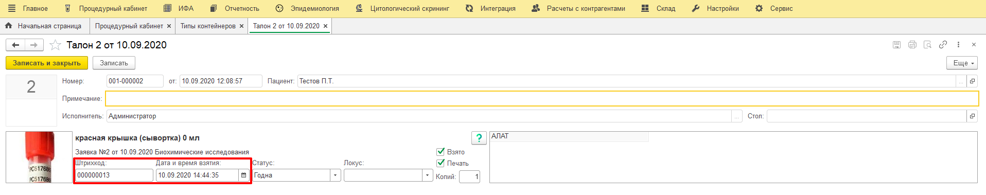 На форме талона можно увидеть полный перечень контейнеров с возможностью указать штрихкод для каждого контейнера, дату и время взятия биоматериала.