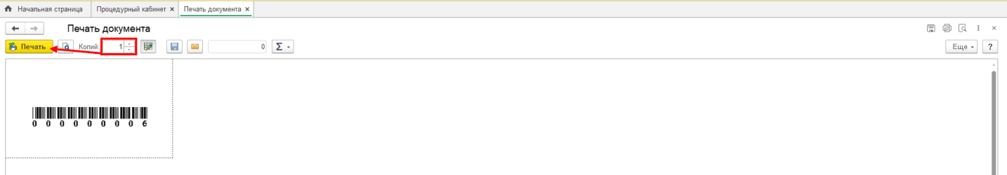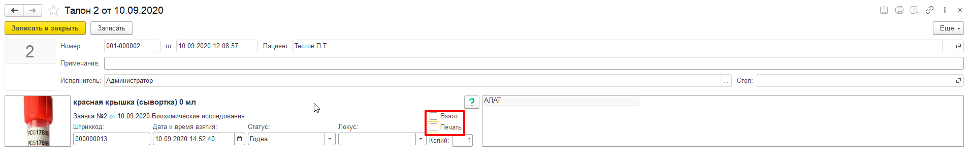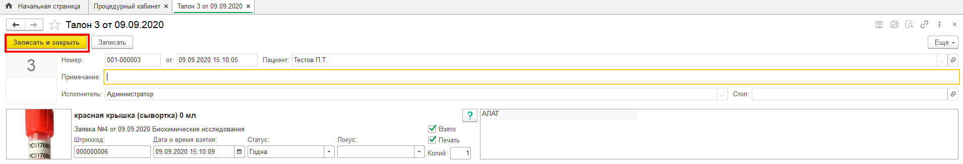 Для установки отметки о заборе биоматериала необходимо нажать кнопку «Записать и закрыть». Система автоматически изменит статус образа с «Требуется взять» на «Взят» и установит статус «Готово» для талона. Так же откроется форма для предварительного просмотра и печати этикеток для образцов.