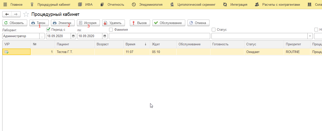 Перейдем в раздел «Процедурный кабинет», далее перейдем по ссылке «Процедурный кабинет». Откроется форма списка талонов процедурного кабинета. Одному заказу будет соответствовать один талон. Каждый талон будет привязан к определенному процедурному кабинету, это определяется в момент создания заказа с указанием реквизита «Процедурный кабинет». Для каждого рабочего места пользователя ЛИС указывается привязка к процедурным кабинетам, это позволяет видеть только актуальные талоны.