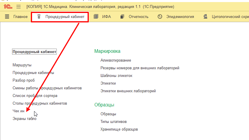 Для сотрудников лаборатории также доступна часть функционала по учету движения образцов. Если перейти в раздел «Процедурный кабинет» и далее по ссылке «Чек-ин», то можно открыть форму проверки образца.