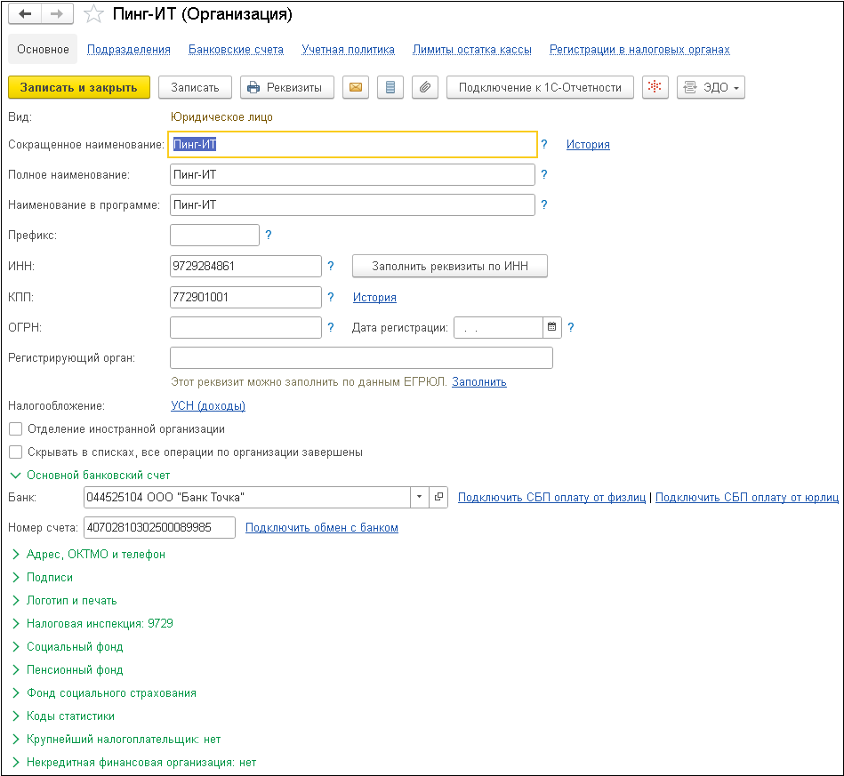 2. Выполните настройку в программе "1С:Бухгалтерия":