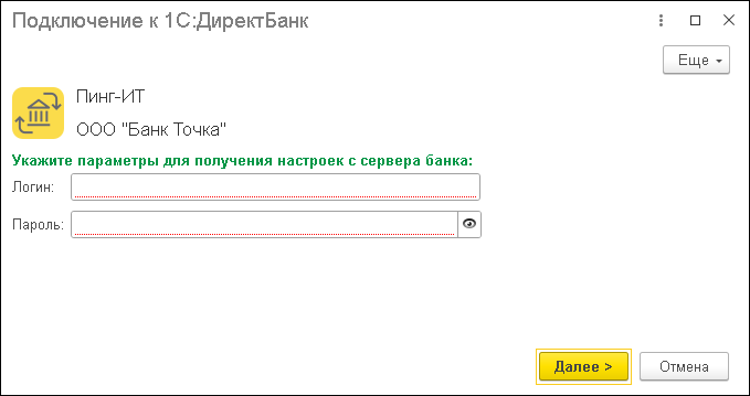 Введите логин и пароль, полученные в банке для интеграции с 1С.