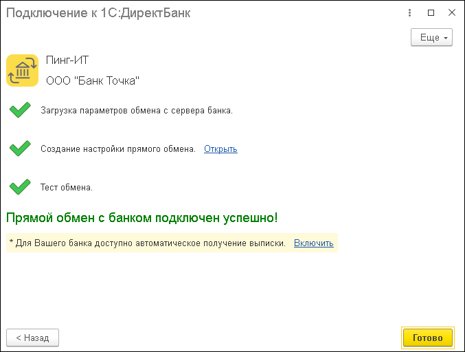 2.3. В случае успешного подключения, помощник сообщит "Прямой обмен с банком подключен успешно".