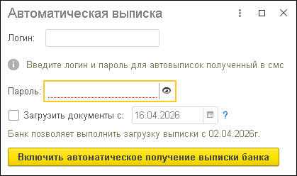В открывшемся окне введите логин и пароль, полученные в банке для подключения автовыписок, и нажмите Включить автоматическое получение выписки банка.