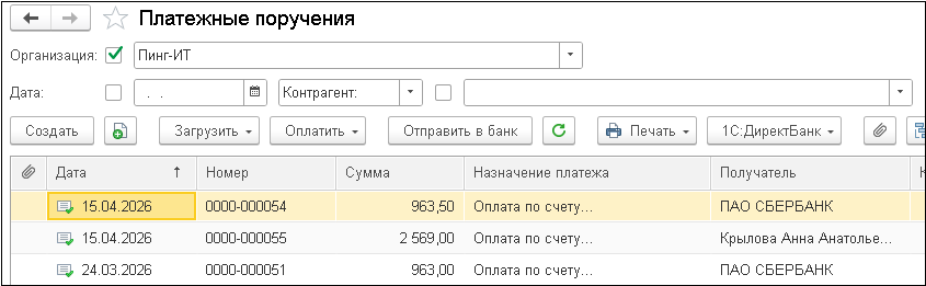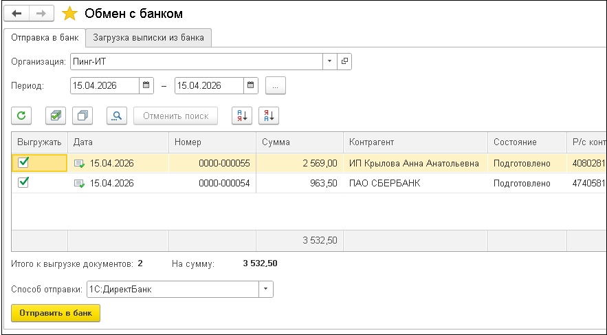 Укажите платежные получения, выберите способ отправки 1С:ДиректБанк и нажмите Отправить в банк.