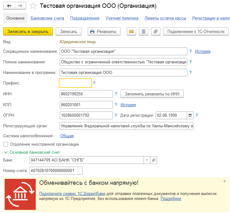 2. Выполните настройку в программе "1С:Бухгалтерия":