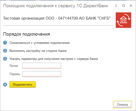 2.2. С помощью Помощника подключения к сервису 1С:ДиректБанк выполните необходимые настройки. Введите пароль от учетной записи для входа в личный кабинет системы "СНГБ Онлайн Бизнес".