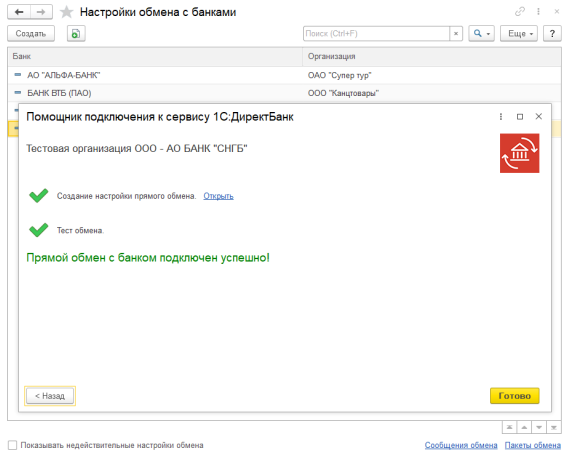 2.3. В случае успешного подключения, помощник сообщит "Прямой обмен с банком подключен успешно".