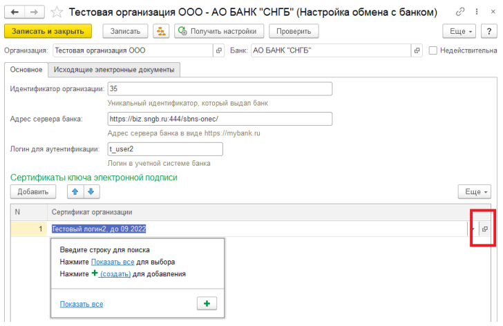 2.4. Проверьте сертификат ключа электронной подписи. Откройте Настройку обмена с банком, откройте Сертификат ключа электронной подписи.