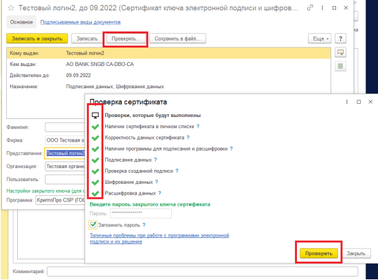 Нажмите Проверить. Тест должен пройти успешно по всем пунктам.