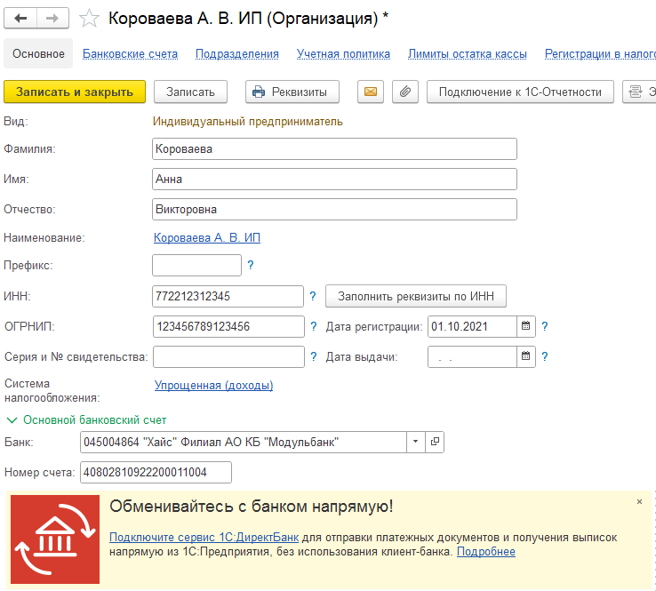 2. Выполните настройку в программе "1С:Бухгалтерия":