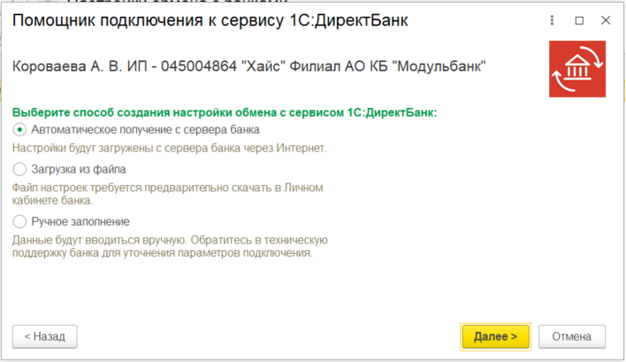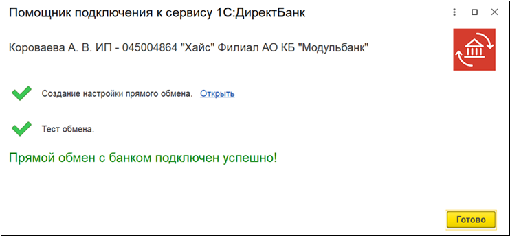 2.3. В случае успешного подключения, помощник сообщит "Прямой обмен с банком подключен успешно".